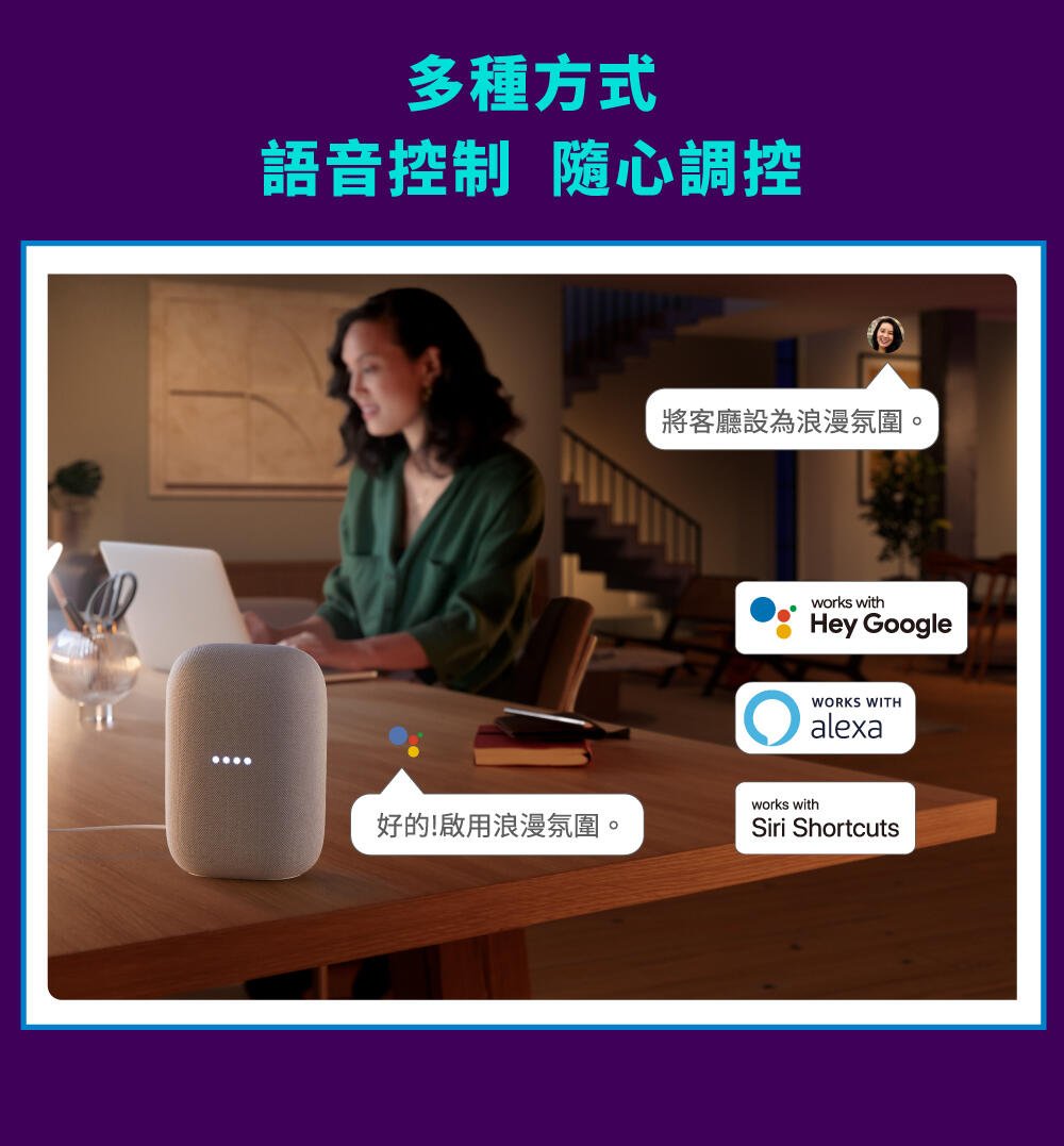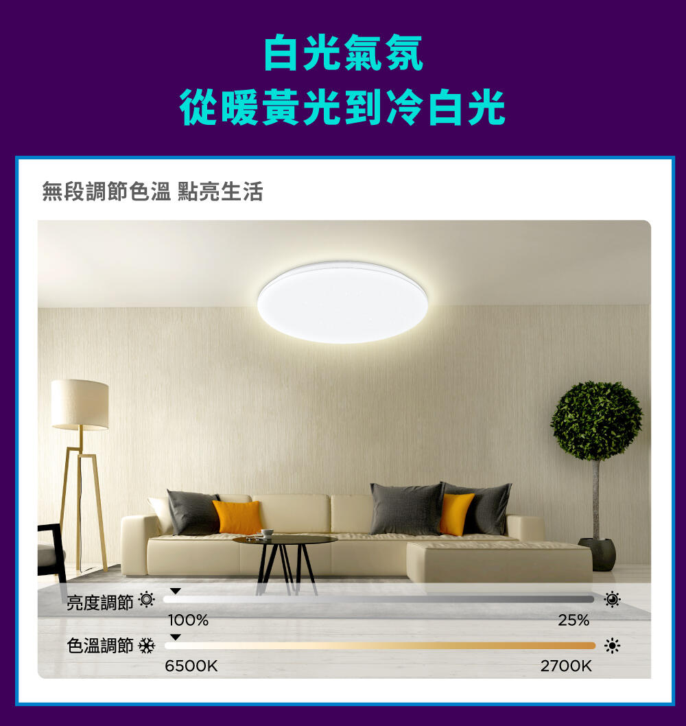 • 多種操控方式,隨時隨地輕鬆控制,暖光至白光選擇,色溫可調2700-6500K