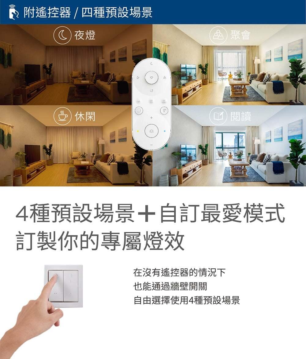 💡光感體驗:4種預設場景(夜燈、聚會、休閒、閱讀)+自訂最愛模式